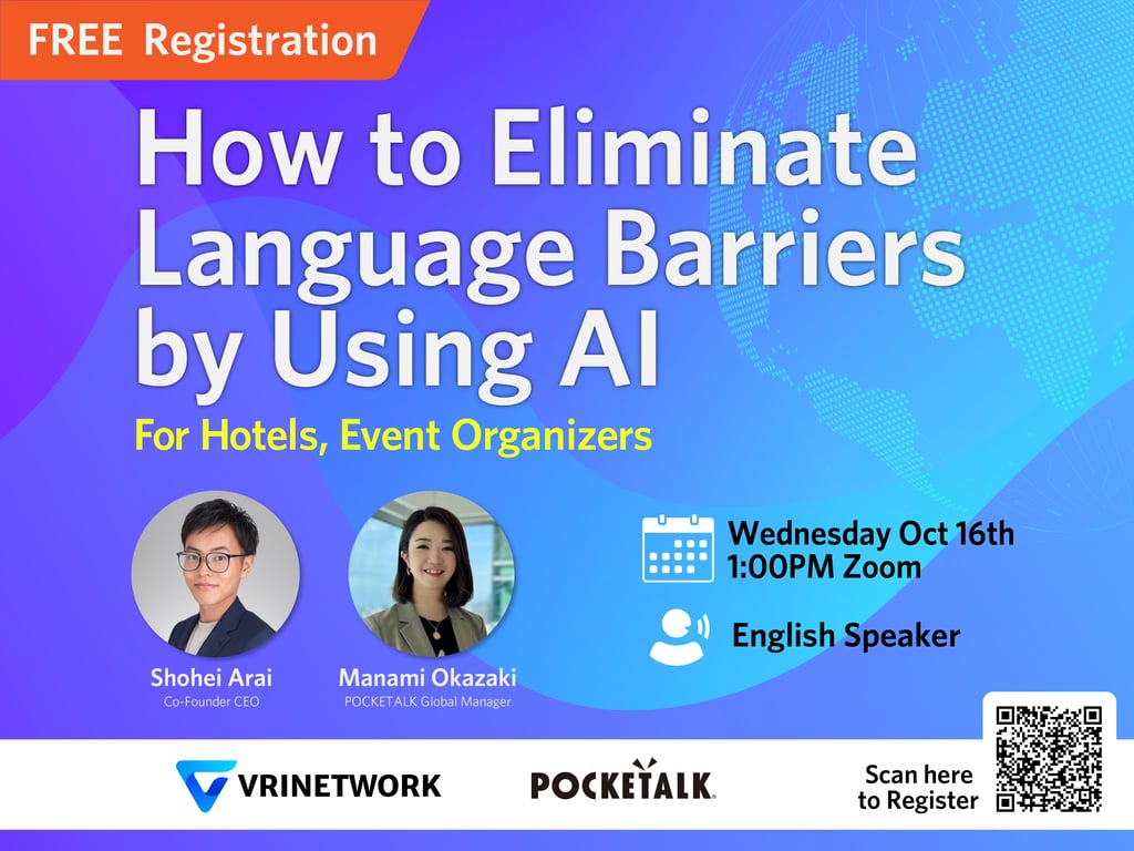 VRINETWORKS and POCKETALK will hold a free online seminar titled “How to Eliminate Language Barriers by Using AI” on October 16, 2024. The seminar will explore how AI can help the hospitality industry overcome cross-language communication challenges. POCKETALK’s AI solutions will be introduced, along with case studies demonstrating how these technologies improve customer experiences and operational efficiency. The event is open to industry professionals interested in learning about innovations in cross-language communication.