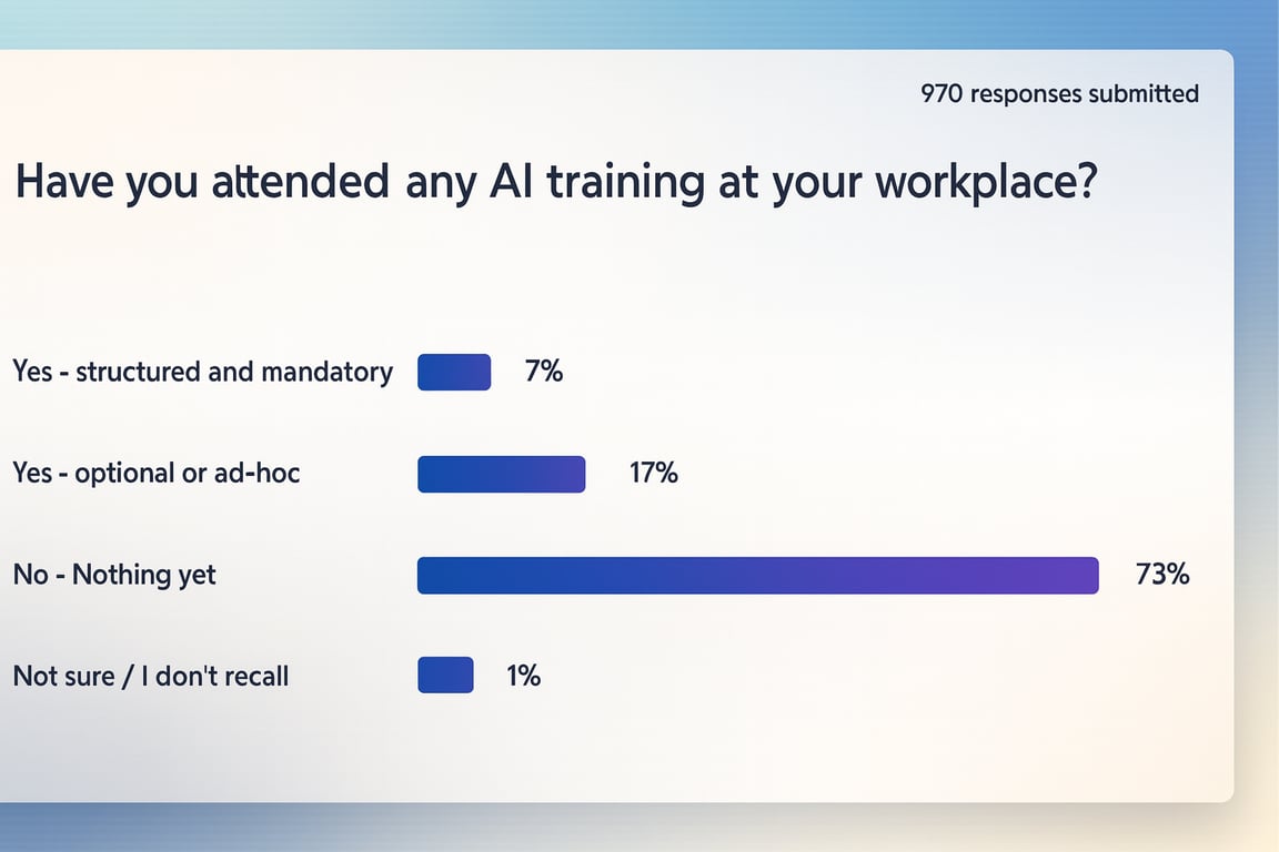 While 73% of professionals reported having no formal AI training at their workplace, a resilient 55% already rate themselves as “Intermediate” users.